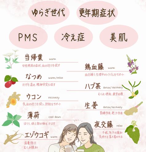 ホルモンバランスの乱れによるPMSや生理痛、加齢によるホルモンバランスの切り替わりなどで様々な症状が引き起こされる更年期に、そっと寄り添う漢方茶です。